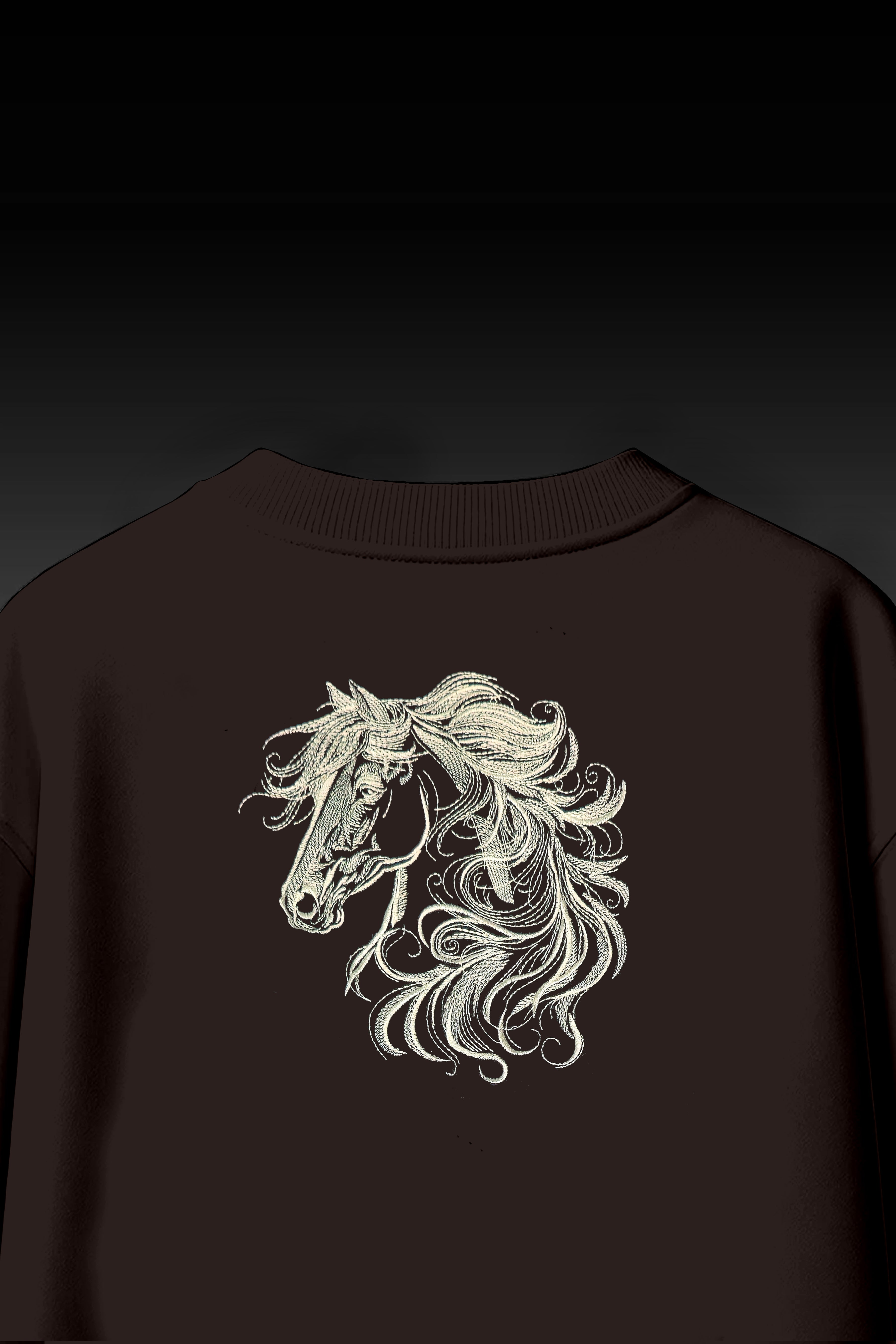 Showcase bold equestrian style with this eye-catching Brown t-shirt, featuring classic Old English "HORSE" embroidery on the front for a vintage-inspired touch. The back is adorned with a detailed and artistic embroidery of a horse's head, with intricate flowing mane lines that add personality and movement to the design. Perfect for horse enthusiasts and those who appreciate unique statement fashion, this comfortable unisex t-shirt pairs effortlessly with any casual outfit, making it a versatile choice for every season.