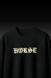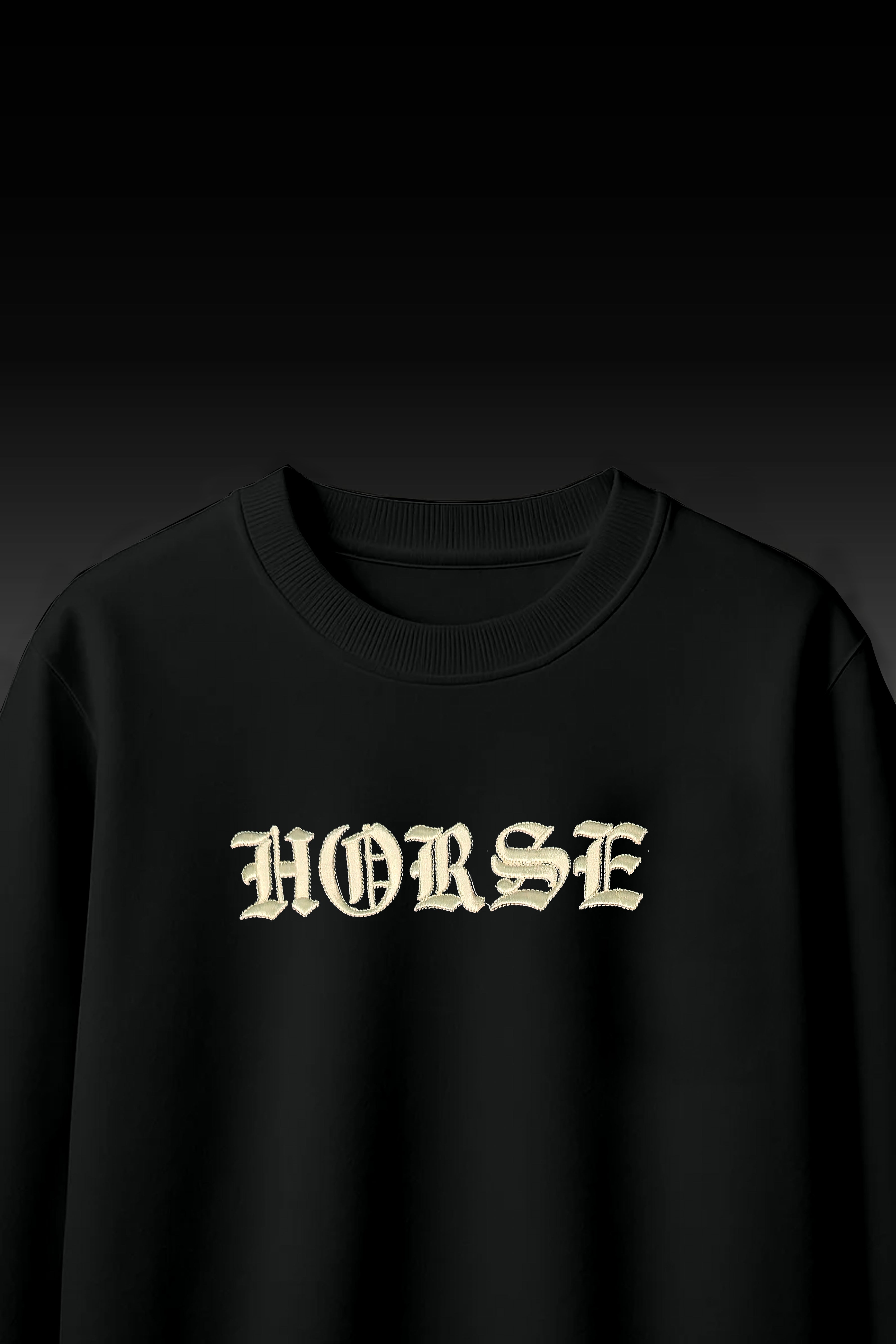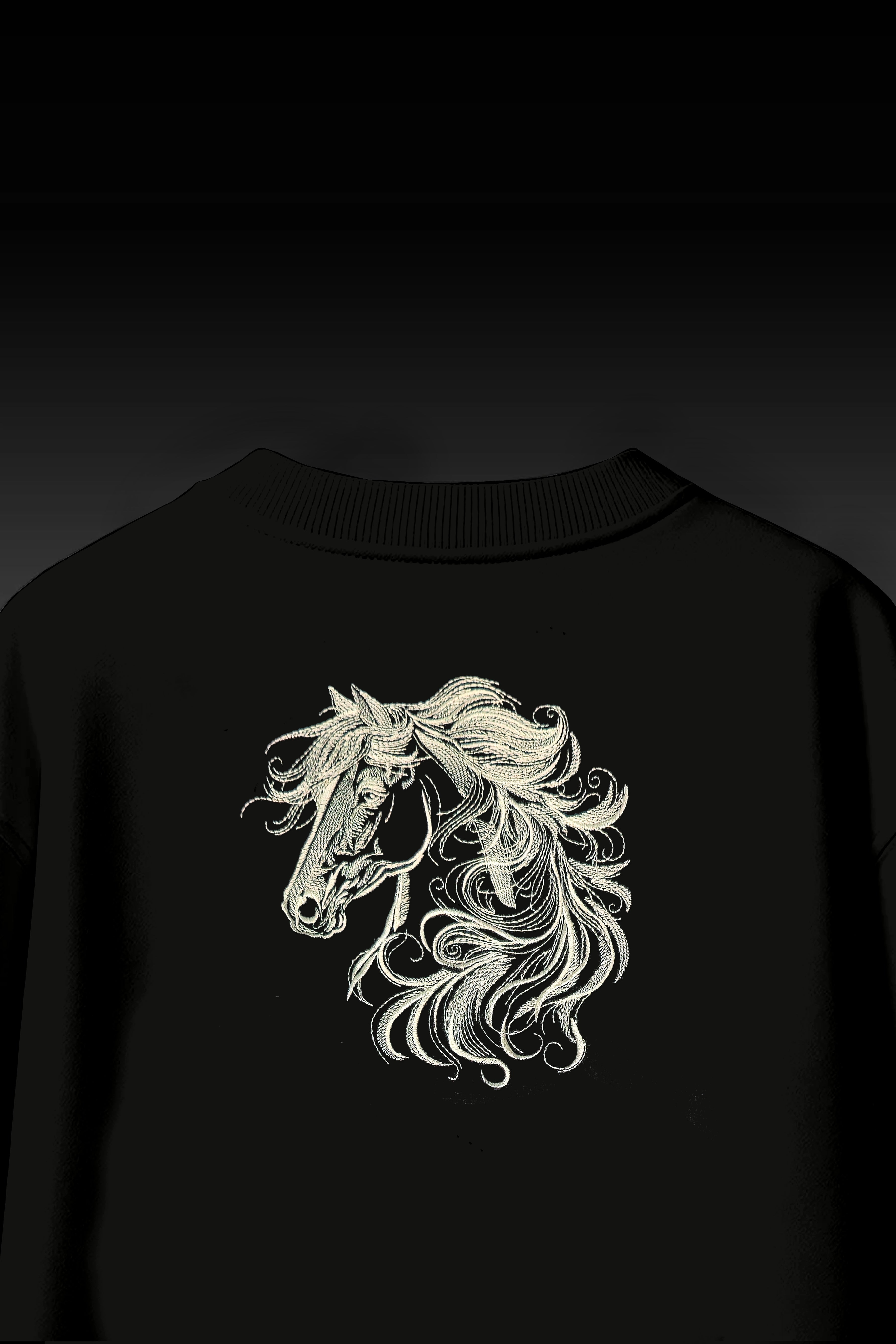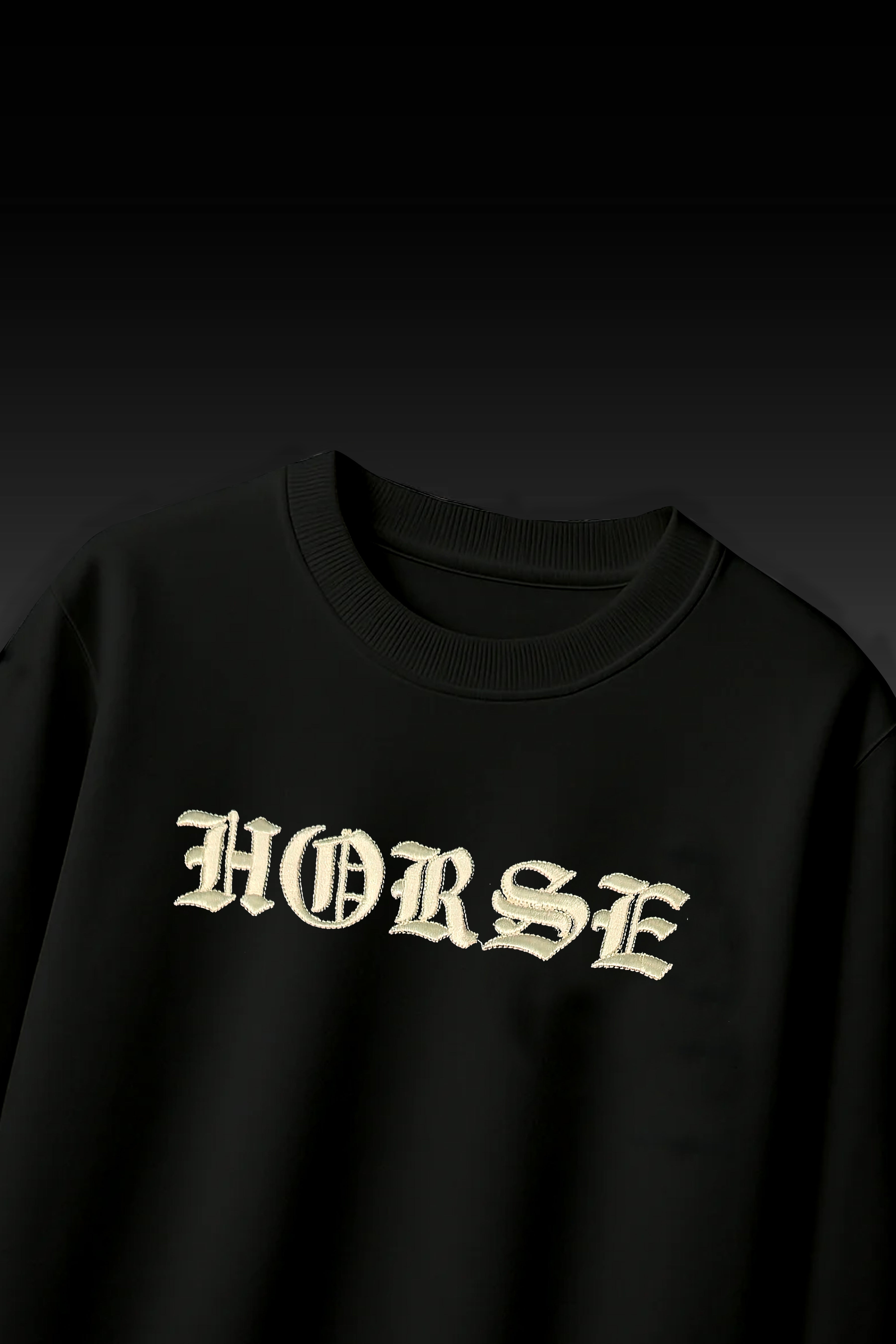Elevate your casual style with this striking black t-shirt, featuring bold Old English "HORSE" embroidery on the front for a vintage edge. The back showcases an intricately embroidered illustration of a horse's head with flowing mane, adding a touch of artistic flair and personality. Crafted for comfort and style, this t-shirt is perfect for horse lovers and anyone seeking unique statement apparel. Ideal for both men and women, pair it with jeans or joggers for a standout look in any season.