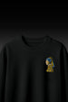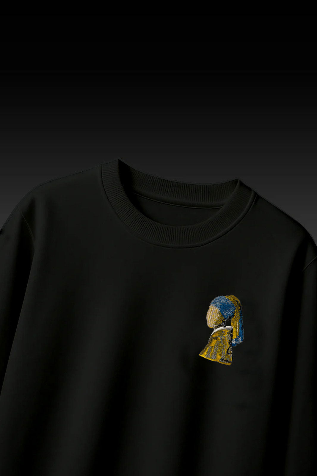This black t-shirt showcases a finely embroidered patch inspired by the iconic "Girl with a Pearl Earring" painting. Featuring elegant blue and gold detail, the embroidery adds a touch of classic art sophistication to the casual, modern design. Perfect for art enthusiasts and fashion lovers alike, this t-shirt combines timeless elegance with everyday comfort and style.