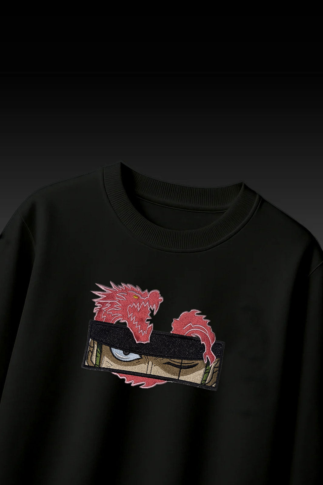 This black t-shirt showcases a vivid embroidered design featuring intense eyes framed in black, paired with a fierce red dragon bursting above and below the graphic. The deep black fabric creates a powerful contrast, highlighting the dragon's vibrant details and delivering strong anime-inspired attitude. Ideal for fans of bold streetwear and those seeking a visually striking statement piece, this shirt offers comfort, quality, and unmistakable mythical flair.