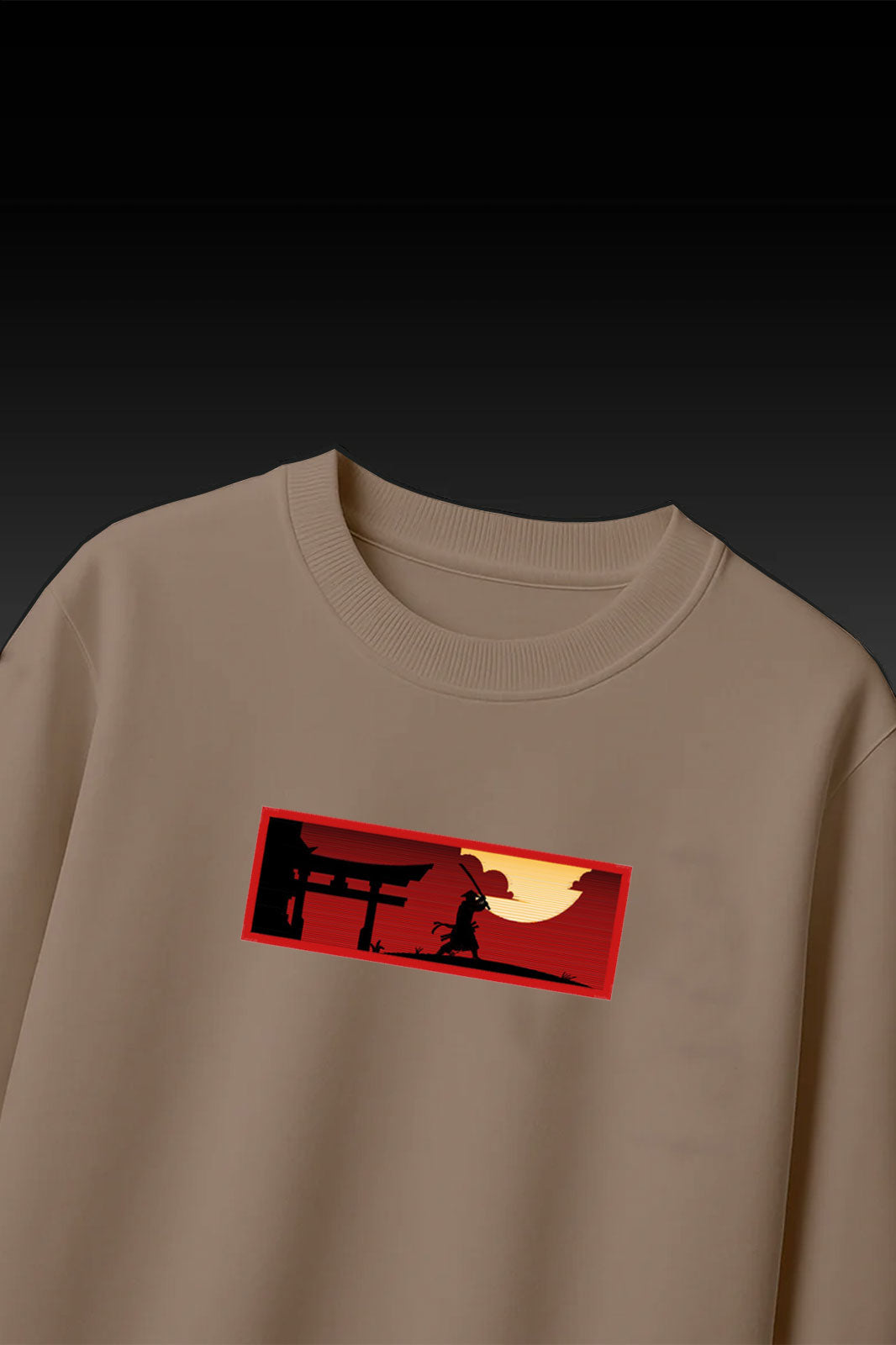 This cream-colored t-shirt features a vivid embroidered patch with the silhouette of a samurai holding a raised sword, set in front of a torii gate and a dramatic red sunset with a yellow sun. The artistic scene blends traditional Japanese influences with a contemporary edge, making this tee a standout piece. Crafted for all-day comfort and eye-catching style, this t-shirt is perfect for fans of unique streetwear or anyone seeking an artistic statement in their everyday wardrobe.