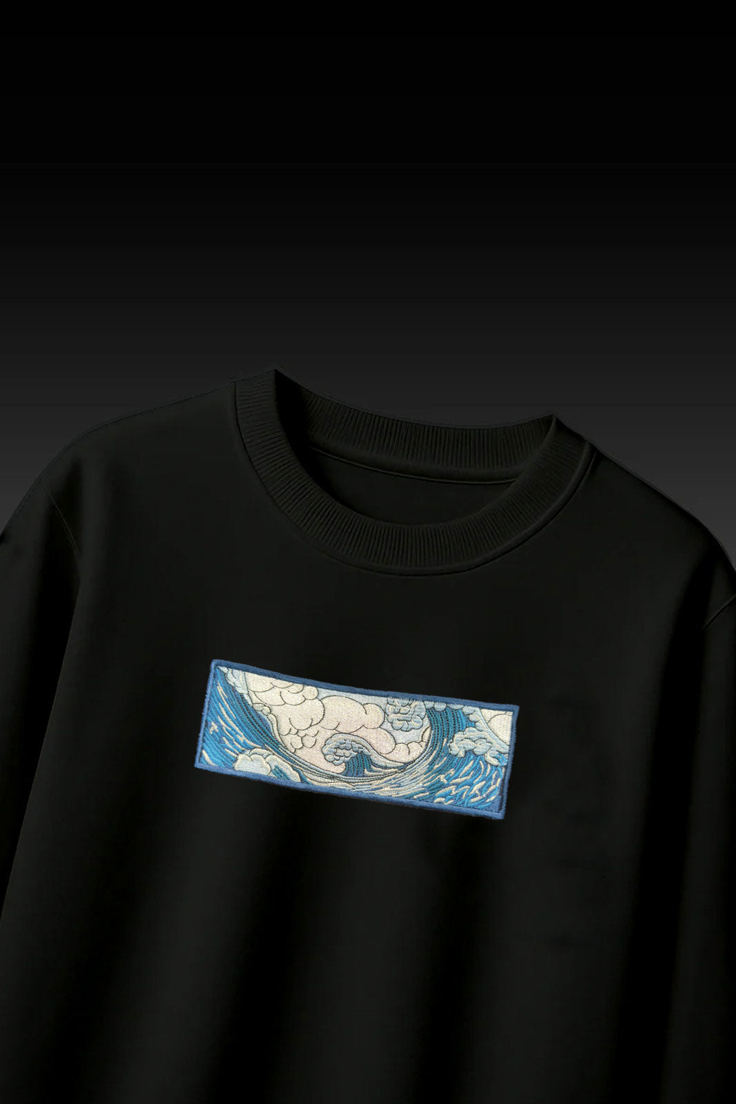 This black t-shirt features a striking embroidered patch depicting an artistic wave design inspired by traditional Japanese art. The vibrant blue and white stitching creates a dynamic, textured look, making it perfect for those who appreciate unique, statement fashion pieces. Crafted for comfort and style, this t-shirt is ideal for casual wear or layering in any season.